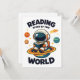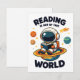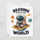 Reading is out of this world shows a cute astronaut sitting on a bright planet while reading a book in space. A playful space themed reading scene for book lovers, students and science fans who enjoy imagination and curiosity.