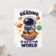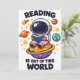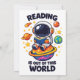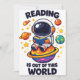 Reading is out of this world shows a cute astronaut sitting on a bright planet while reading a book in space. A playful space themed reading scene for book lovers, students and science fans who enjoy imagination and curiosity.