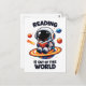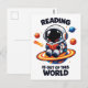 Reading is out of this world shows a cute astronaut sitting on a bright planet while reading a book in space. A playful space themed reading scene for book lovers, students and science fans who enjoy imagination and curiosity.