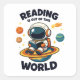 Reading is out of this world shows a cute astronaut sitting on a bright planet while reading a book in space. A playful space themed reading scene for book lovers, students and science fans who enjoy imagination and curiosity.