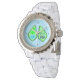 This awesome watch features a graphic image of a green Pea pod containing 2 green peas and a big blue pea. The large blue pea has a cute little face with eyes and a mouth. On the other side of the pea pod in darker pink text it says "Baby Boy Ready to Pop".