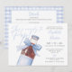 This fun baby shower invitation features a retro soda bottle with a pretty blue bow and can be personalized with your details set in stylish typography. The reverse features your event details and registry QR code on a blue gingham background. Designed by Thisisnotme©