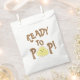 This custom treat bag features a cute baby shower popcorn theme. The phrase "Ready to Pop" is printed across the front in a whimsical toasted brown font. The letter "O" is replaced with a happy popcorn kernel that has a cute little happy face.