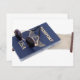 Blue passport needed when travelling between borders, a hammock to string between two solid objects, and a pair of sunglasses display ready for vacation