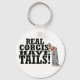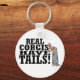 A blue merle Cardigan Welsh Corgi is shaking his tail as he leans on the text, "Real Corgis Have Tails!" Funny corgi keychain is perfect for the cardigan owner.