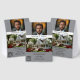 Real Estate broker, sales, realtor, table tent cards. Pretty advertisement card for your real estate company, business. Photo of a pretty, white home with red flowers and trees in the yard. This image can be used for your own cards, commercial use ok. Photo of a salesman should be changed to your own.