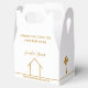 This modern realtor custom favour box is the perfect way to congratulate a homebuyer on their new house purchase. Congratulations on your new home or a different custom message for open house marketing. These minimalist gold and white boxes feature a simple line drawing of a house for a simple, chic real estate agency business.