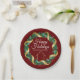 This beautiful realtor Christmas party paper plate is custom made with your realty company name under the the agent name in chic green and red typography within a festive holly berry wreath with gold garland wrapping around the greenery. Contemporary holiday decor for a party.