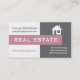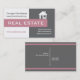 Real estate grey, white, puce pink eye-catching business card featuring a little house in white on grey, white background and a puce band with the text Real Estate. A great professional business card for the realtor.