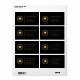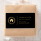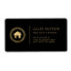 This real estate business shipping label features a faux gold house logo framed by a circular Greek key motif on the left and simple, gold coloured sans serif text on the right, with a vertical line between, on a black background.
