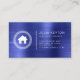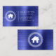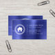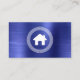 This real estate business card features a white house logo framed by a circular Greek key motif on the left and simple white sans serif text on the right, with a vertical line between, on a sapphire blue brushed metal background. A larger version of the house logo appears on the reverse side.