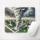 A massive tornado made of swirling money dominates a suburban neighbourhood, creating a surreal and chaotic scene.