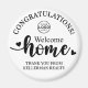 This round magnet makes a sweet and practical welcome gift for new homeowners. At the top, “Congratulations” sits above a space for your company logo. The center features a simple “Welcome Home” design in a mix of script and serif fonts with a couple of small heart accents. Along the bottom is a clean thank you message.
