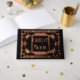 A minimalist yet striking geometric art deco design that has a bold text template in the middle for your custom wording. The "black and rose gold" design plus lettering on the spine are manufactured with real foil giving a luxurious and timeless elegance to this cover. It is ideal for a black and rose gold wedding; a wedding anniversary; a vintage art deco themed event or function or a "roaring 20's'" "Great Gatsby" gala business gathering. Treasure the memories with this bespoke and elegant keepsake.