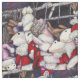 Original whimsical painting of Holiday Dollys by well-season Fine Art Artist, Gaye Elise Beda. A gathering of anthropomorphic mice is dressed in festive, holiday-themed clothing. Their bright red outfits and striped socks create a joyful and playful scene, with each mouse uniquely adorned. The background suggests a wintry setting, enhancing the festive mood.