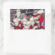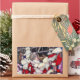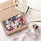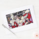Original whimsical painting of Holiday Dollys by well-season Fine Art Artist, Gaye Elise Beda. A gathering of anthropomorphic mice is dressed in festive, holiday-themed clothing. Their bright red outfits and striped socks create a joyful and playful scene, with each mouse uniquely adorned. The background suggests a wintry setting, enhancing the festive mood.