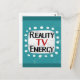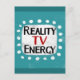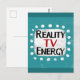 "Reality TV Energy" is a cute text design in blue with black and red text, along with a white accent shape and white textured whimsical dots surrounding it.