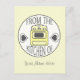 A recipe postcard featuring an illustration of an off white background and a white circle at centre. Illustration of a retro yellow stove with a heart on each side and text above and below which reads "From the Kitchen Of" inside circle. Personalise with your name at bottom. Opposite side features a white rectangle with grey scalloped edges and old fashioned photo corners at right. Text inside rectangle reads "Recipe." Look for matching items at Jill's Paperie.