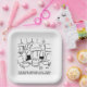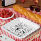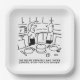 Funny paper plates. A woman is standing motionless in her kitchen having prepared a meal. She explains to her husband that the recipe said "Stand after cooking"!