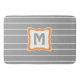 Rectangle Bath mat in 3 different sizes. Grey bathroom rug with grey and white stripes and a centre medallion for your initial. White, Grey and Orange. Matches our Retro Bath Line.