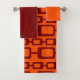 This towel set has an orange washcloth, a maroon hand towel, and a bath towel with a md-century modern design of maroon rounded rectangles connected together on a field of orange.