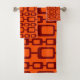 This towel set has a md-century modern design of maroon rounded rectangles connected together on a field of orange.