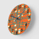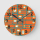 This wall clock has a mid-century modern design of orange rectangles with white and gold circles in them and teal horizontal lines crossing them on a field of teal.