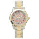 This men's watch has a geometric design of rectangles in tan, grey, and off-white making the background with ovals in brick red overlaying them.