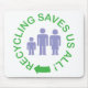 Blue silhouettes of a man, woman and child surrounded by the caption "Recycling Saves Us All" in a circle on Men's Earth Day T-shirts, Women's Earth Day Shirts, Kids Earth Day Shirts, Earth Day Buttons, Aprons, Key Chains and more Gifts. Also great gifts for America Recycles Day in November.