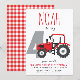 Red Plaid Barn Tractor Farm Birthday Invitation