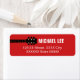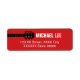 Red address label with a graphic guitar neck, personalised with the name of the musician, and additional information