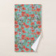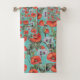 Stylish bath décor features a "field" of red poppies in full bloom on aqua background