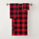 This towel set features black and red buffalo check with a red monogram on black background on the bath towel.