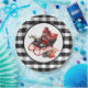 Beautiful vintage Christmas sleigh in vivid red and black decorated with packages in red with black ribbon and black and white buffalo check. A border of black and white buffalo checks completes the arrangement.