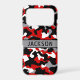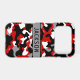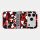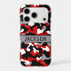 Customise this red, black, grey and white camouflage iPhone 17 pro case with your name in a trendy modern CAP font in black on grey. It's masculine and perfect for your favourite military, hunting, country or outdoorsman!