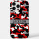 Customise this red, black, grey and white camouflage iPhone 16 pro max case with your name in a trendy modern CAP font in black on grey. It's masculine and perfect for your favourite military, hunting, country or outdoorsman!