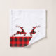 A red and black plaid border with Christmas deer in the same plaid over white background.