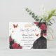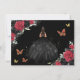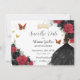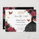 Personalize this pretty red and black floral Quinceañera / Sweet 16 birthday save the date easily and quickly. Simply click the customize it further button to edit the texts, change fonts and fonts colors. Featuring a girl dressed in a beautiful glittery black ball gown, vibrant red and black roses, butterflies and gold elements. Matching items available in store. (c) Somerset Fine Paperie