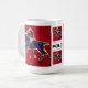 Blue ceramic painted polo horse and player on red background. White mug. Custom art by StudioNancyAlcott.