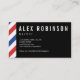 A patterned business card for a barber featuring red and blue stripes on a white background. On one side, the design covers the whole area of the card with a space for appointment details in the centre and on the other side, there's a narrow stripe down one edge leaving plenty of room for your name and details in white text on a black background.