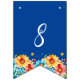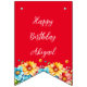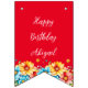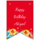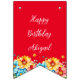 Personalised birthday banner in red and blue with pretty watercolor illustration of a birthday cake with flowers, age and name.