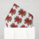 Tissue paper with a festive Christmas bow in red and gold. Surrounded by poinsettia flowers, pine and Christmas decorations.