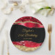 This elegant and glamourous birthday party plate features red and gold faux glitter glam tears on a black background. The text combines handwritten script and modern sans serif fonts for a classy and sophisticated look.