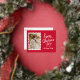 Cute Valentine's Day photo postcard featuring your vertical photo inside of a white postage stamp frame. The phrase "Happy Valentine's Day" is displayed in whimsical, white hand-lettering surrounded by gold foil hearts. Personalise the front of the gold foil Valentine's Day postcard with your family name in white lettering on a red background. The postcard reverses to display your return address and personal message in red lettering.