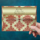 This elegant design, called Red and Gold Indian Damask Wedding, has a gold background with a red damask pattern. On the front there is a gold band with faux diamond band for your names and Lord Genesha just above. The back has a red and gold background with your text in gold. This set has invitations, save the date cards, response cards, thank you cards, table number cards, wine labels, wedding programs, and many more day-of wedding stationery pieces, favours, and gifts to coordinate. All elements are printed on our high quality products, they do not include any real gold, jewels, embossing, or other textile elements. All designs are copyright Noteable Expressions, Inc. All rights reserved.