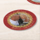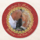 Regal red and gold Wedding party coasters to personalise with your own photograph and text. Rich textured looking red background with an ornate gold frame and text surrounding your image.