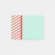 Cute sticky notes with a left side border with a red green and white diagonal striped christmas pattern. Reminsicent of peppermint flavoued Christmas candy canes. The background is a soft pastel green.