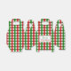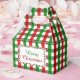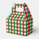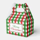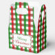 Red and green gingham pattern. Red and green chequered gingham. A white shape in the middle with the text "Merry Christmas".