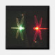 Two glowing dragonflies flying towards each other, one is green and the other is red.