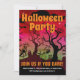 Red and green haunted graveyard Halloween party invitation. It features a graveyard in red and olive green with gravestones, sooky trees, a witch, an owl, bats and your text. The cover has been designed using some assets from Freepik.com